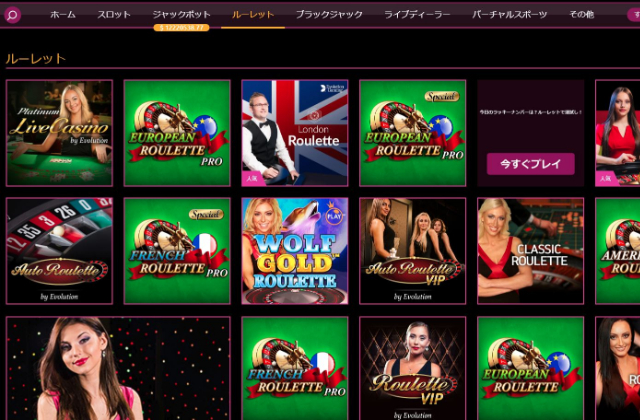 | ルーレットの種類 | ・Deutsches Roulette ・London Roulette ・WOLF GOLD ROULETTE ・CLASSIC ROULETTE ・IMMERSIVE ROULETTE ・VIP ROULETTE ・FRENCH ROULETTE GOLD ・JOKER JWELS ROULETTE ・ITALIAN ROULETTE ・GOLD RUSH ROULETTE ・CLUB ROULETTE ・SVENSK ROULETTE ・DIAMOND STRILE ROULRHINO ROULETTE ・GREAT RHINO ROULETTE |