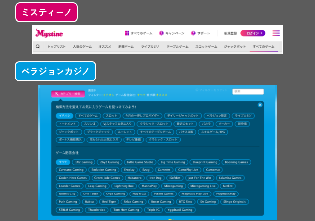 プロバイダー別でゲーム検索ができません。ミスティーノのゲーム検索機能は経験者でも使いにくいです。