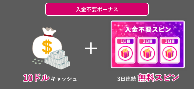 | ボーナス | ・$10+60回フリースピン(登録ボーナス) ・入金特典デイリースピン |