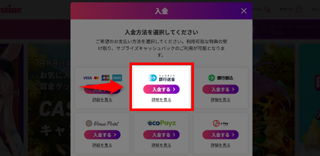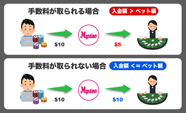 通常のオンラインカジノの場合、銀行送金の手数料が1~3%程度かかるため、エコペイズなどの電子決済サービスを選ぶことが多いですが、ミスティーノはその必要がありません。