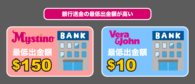 銀行送金で残念な点をあえて挙げるとすれば、最低出金額が$150(25,000円)と少し高いところでしょう。もう少し最低出金額のラインが下がれば、より利用しやすいと思うプレイヤーは多くなるはずです。