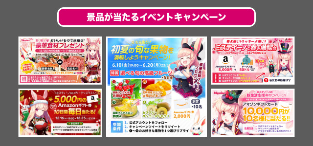 ミスティーノは不定期でイベントキャンペーンを開催しています。中には抽選でディズニーリゾートのぺアチケットや、Amazonギフト券などのお得な景品が当たるキャンペーンもあります。