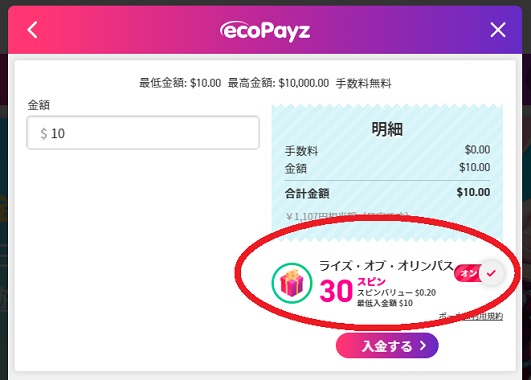 なお、入金画面にあるチェックボタンをオフにしてしまうと、ボーナスが申請できないので注意してください。獲得希望の場合は、必ず「オン」にした状態で入金を完了させてください。