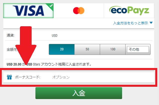 初回入金ボーナスを獲得したい場合は、初回入金時の入金画面でボーナスコードを入力して決済する必要があります。