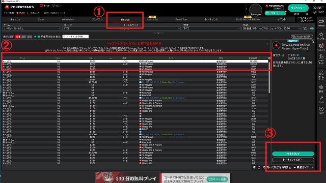 ①画面上部のメニューで「Sit&Go」or「トーナメント」を選択する