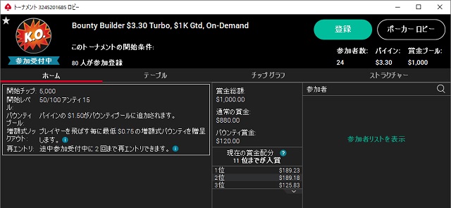 トーナメントロビーでは、トーナメントルールの他、賞金総額や上位入賞者の賞金、参加者リストなどをチェックできます。