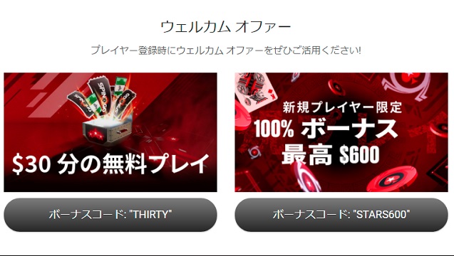 ポーカースターズでは新規登録者向けに選べる2つの初回入金ボーナスを用意しています。1つは$30無料ボーナス、もう1つは最大$600の100%入金ボーナスです。