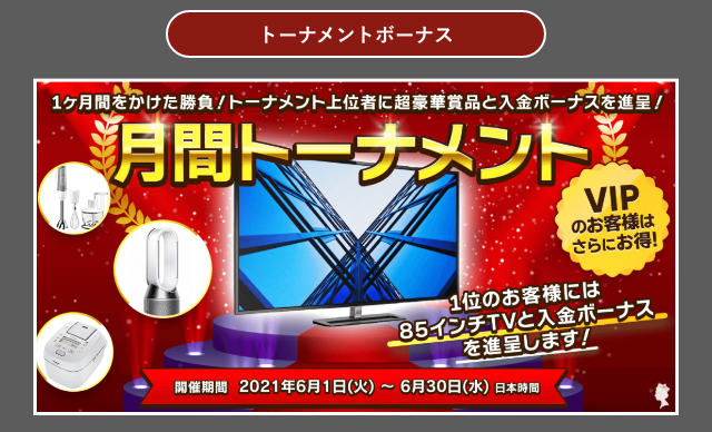 なお、トーナメントボーナスの内容については、都度異なるため、ボーナス取得条件や、出金条件などは、都度クイーンカジノの利用規約をお読みください。