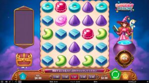当たりが続いてシュガーラッシュメーターが満タンになると、エリクサーでリールが5×5から9×9に増えたり、宝箱で追加賞金が発生したりとお祭り騒ぎになります。