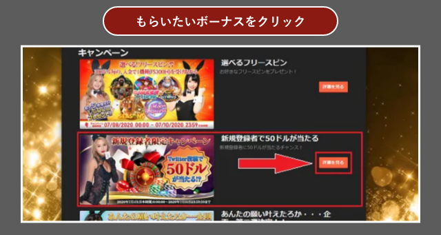 現在は「新規登録者で50ドルが当たる」というイベント(開催期間2020年7月1日~7月31日)があります。開催期間中にクイーンカジノに新規登録し、公式Twitterアカウントをフォローして初回入金をするだけで50ドルのボーナスが当たるイベントです。ノーリスクで50ドルもらえるイベントは他を探してもなかなかありません。