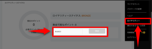レベルロイヤリティ―ポイントは、カジノゲームをプレイすると貯まっていきます。こちらは換金とロイヤリティーステータスのランクアップの2つに使用可能です。