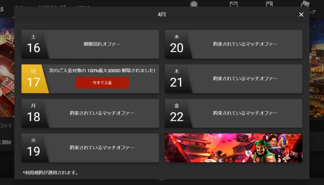 約束されているマッチオファーは、毎日獲得できるデイリーボーナスです。獲得したオファー内容は、画面上部メニューの『プロモーション』から確認できます。(ログイン時にも表示されます。)