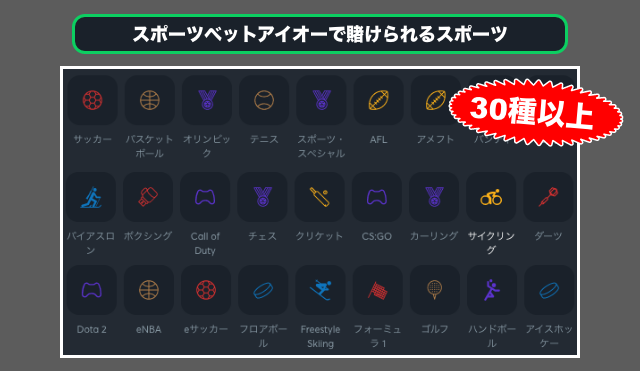 スポーツベットアイオーでは30種類以上のスポーツに対して、すべて仮想通貨でベットできます。