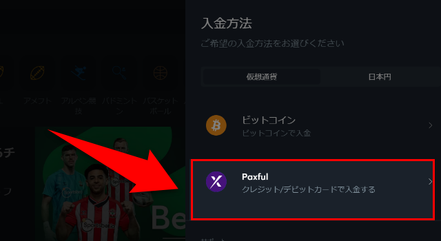 クレジットカード入金したい場合は入金画面で購入したい仮想通貨を選択し、入金方法で「PAXFUL」を選択してください。