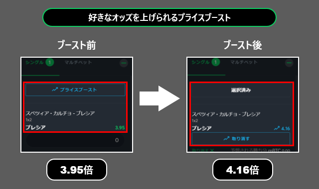スポーツベットアイオーにはオッズを上げられる「プライスブースト」と呼ばれる機能があります。プライスブーストは各スポーツカテゴリで毎日1回使用可能です。