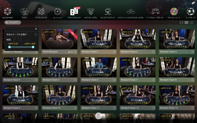 | ブラックジャックの種類 | ・ブラックジャック ・ブラックジャックホワイト ・ブラックジャックパーティー ・ブラックジャックシルバー ・ブラックジャックグランド ・ブラックジャックフォーチュン ・Blackjack Classic ・Infinite Blackjack ・Blackjack VIP ・Bitcasino.io Blackjack ・Salon Prive Blackjack |