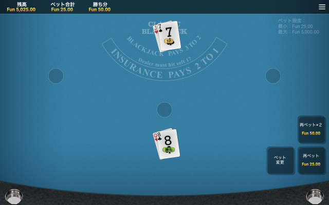 通常のブラックジャックだと最大7席なのでなかなかテーブルにつけないということがありますが、このゲームならスムーズにゲームを始めることができますね。