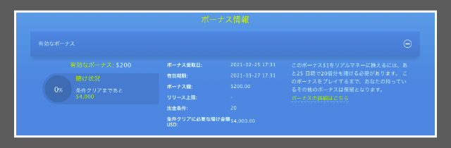 例えば、20ドルのボーナスがあった場合、出金条件は400ドルなので、400ドルのボーナスを賭けなければ出金条件をクリアできません。