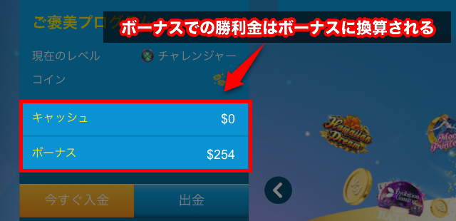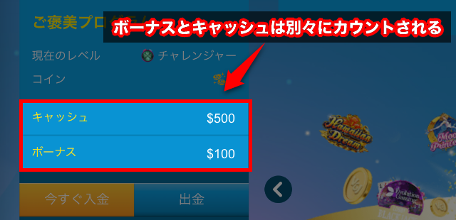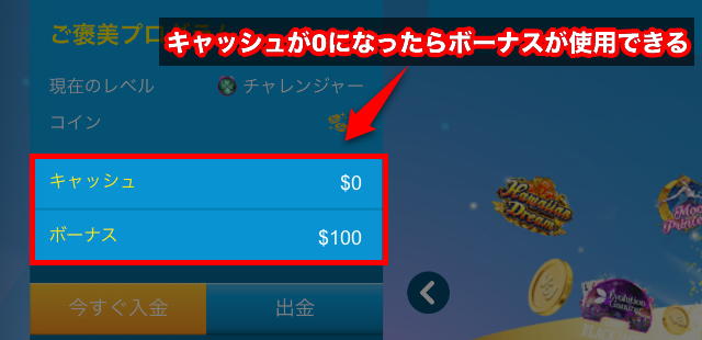 - 当ボーナスはキャッシュの残高が0になった時点で使用できます。