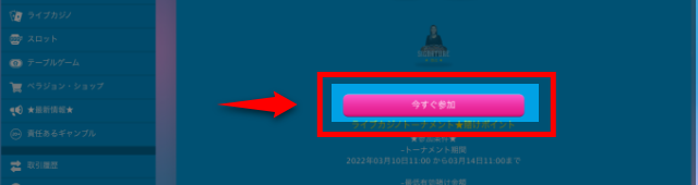 「今すぐ参加」をクリックするだけで、トーナメントのエントリーは完了です。あとは、指定のカジノゲームで遊び、上位に入賞できればボーナスが貰えます。