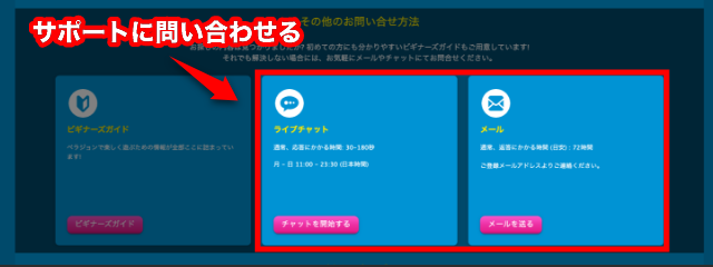 サポートページは、メニューの「問い合わせボタン」からアクセスできます。メールだと少しタイムラグが発生するので、ライブチャットがおすすめです。ライブチャットの対応時間は、毎日11:00 – 23:00です。