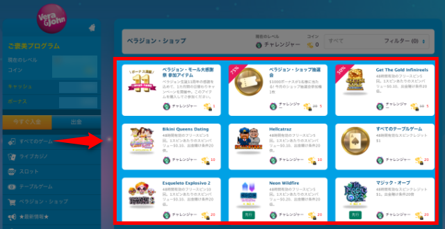 - ベラジョンカジノのショップで獲得できるアイテムは毎月変更されます。