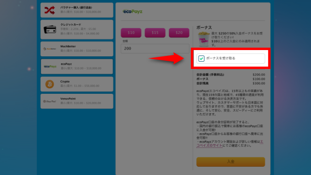 ビギナーズボーナスを受け取る際は、入金画面の「ボーナスを受け取る」にチェックを入れてください。