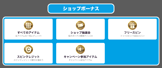 ベラジョンカジノは、集めたコインでボーナスアイテムが購入できるショップと呼ばれるシステムがあります。ショップで購入できるメインのボーナスは下記の通りです。