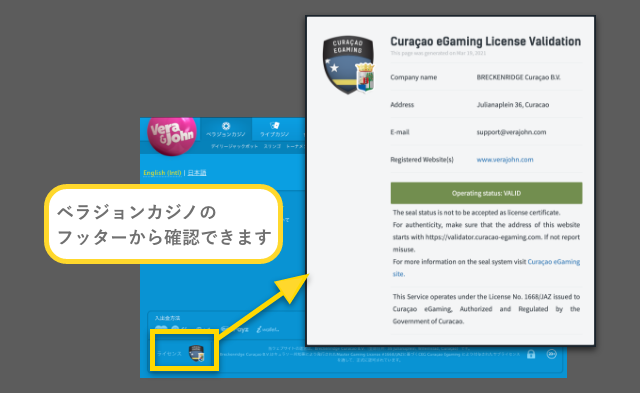 ベラジョンカジノは、世界で最も信頼性の高い国際ライセンスの一つキュラソーのライセンスを取得しています。