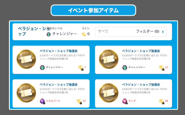 ベラジョンカジノでは各種イベントを開催しており、イベント参加用のアイテムをベラジョン・ショップで販売しています。