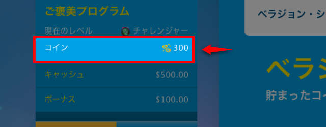 ベラジョンカジノのコインは、新ご褒美プログラムで支給されるベラジョン専用通貨です。カジノゲームでキャッシュプレイすると貰えます。いわばポイント還元システムと思っていただいた方がイメージしやすいでしょう。