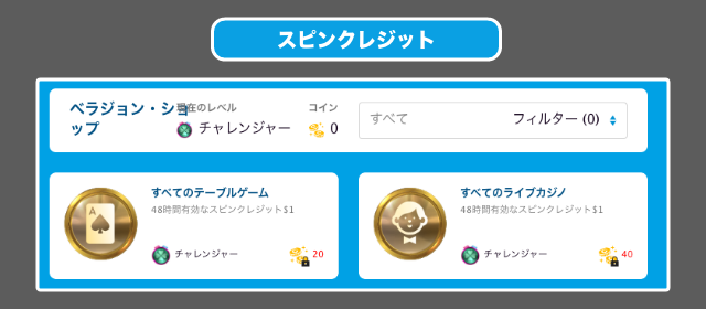 スピンクレジットは下位レベルでも比較的少ないコイン数でゲットできます。貰える額はその分少ないですし、出金条件20倍もかかりますが、軍資金のちょい足しに使いたい人にはうってつけでしょう。