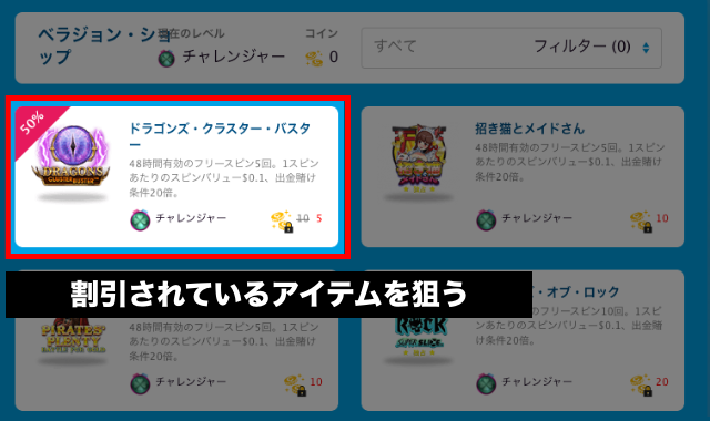 割引アイテムは通常よりも少ないコインでボーナスを受け取れるため、優先して購入すれば、コインを効率良く貯めることが可能です。