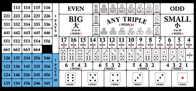 大小(シックボー)は3つのサイコロを同時に振った出目を予想する簡単なゲームです。ルーレットのようにベット箇所がたくさんあり複雑そうに見えますが、意外と簡単です。