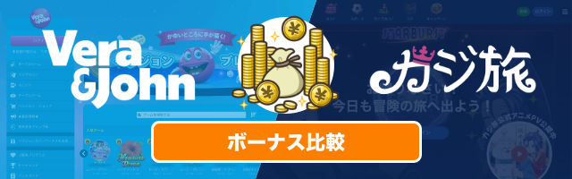 比較結果をもとに、本記事ではどちらのオンラインカジノで遊んだ方がお得なのかを解説していきます。ベラジョンカジノで遊ぶかカジ旅で遊ぶか悩んでいる人のヒントになれば幸いです。