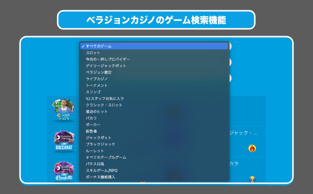 ゲームの操作性に関してはベラジョンカジノの方が上でしょう。特にベラジョンカジノはゲーム検索機能が優れており、カテゴリ別・プロバイダ別で好みのゲームを一発検索できます。