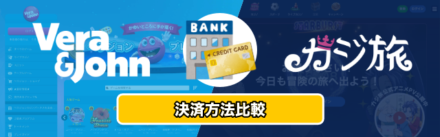 ベラジョンカジノとカジ旅で決済面に違いはあるのか。入出金それぞれで使用できる決済種類と限度額を比較します。