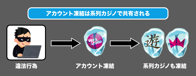 ベラジョンカジノでアカウント凍結されれば、インターカジノやもう一つの系列カジノである遊雅堂でも同じ措置をとられます。インターカジノで凍結されても同じことです。