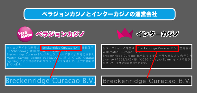 ベラジョンカジノとインターカジノの運営会社名は「Breckenridge Curaçao B.V.」です。それぞれのサイトのトップページ下側に記載されている会社情報で確認できました。