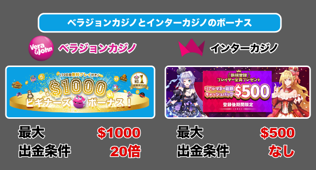 大きな違いはベラジョンカジノのビギナーズボーナス$1,000とインターカジノのウェルカムキャッシュバック$500です。