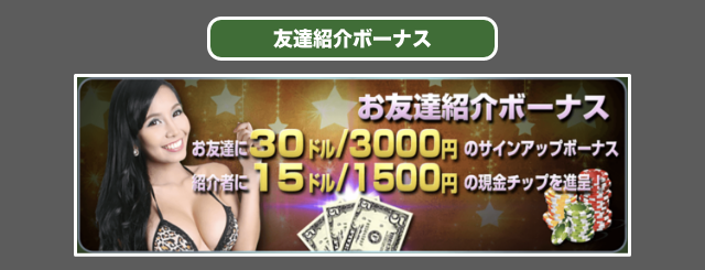 ワイルドジャングルカジノの友達紹介ボーナスでは、紹介者に$15の現金チップ、友達に$30のボーナスキャッシュが進呈されます。