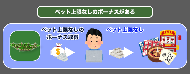 ワイルドジャングルカジノにはベット上限なしのボーナスが定期的に配布されているため、ぜひ獲得しましょう。
