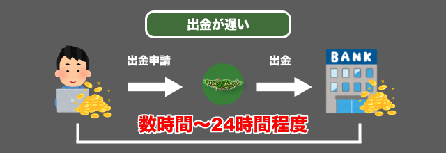 プレイヤーからは「出金が遅い」との口コミが挙がっていますが、ワイルドジャングルカジノの出金時間は決して遅いわけではありません。他のオンラインカジノでは、出金処理に2~3営業日掛かることもあるからです。