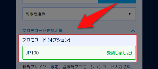 新規登録手続き画面の最後に「プロモーションコードを加える」という項目があります。こちらをクリックして「JP100」と入力してください。