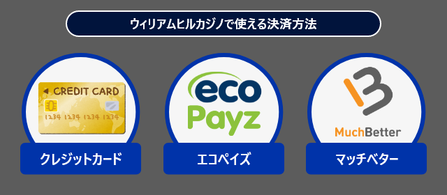 ウィリアムヒルカジノではクレジットカード、エコペイズ、マッチベターを入金で使用できます。