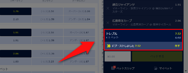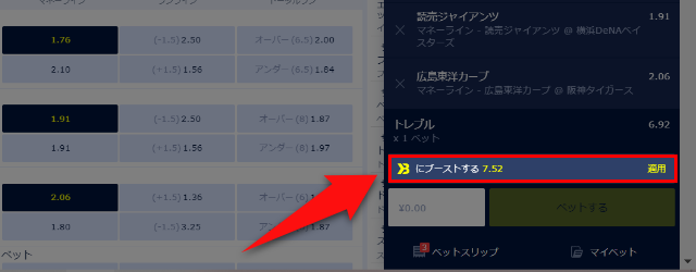 増強オッズ項目で黄色いオッズボタンをクリックすれば、増強オッズを適用できます。