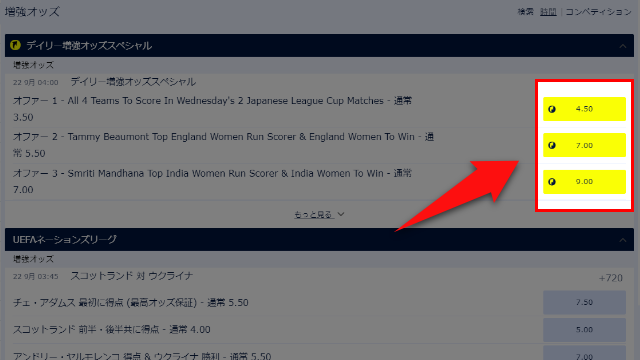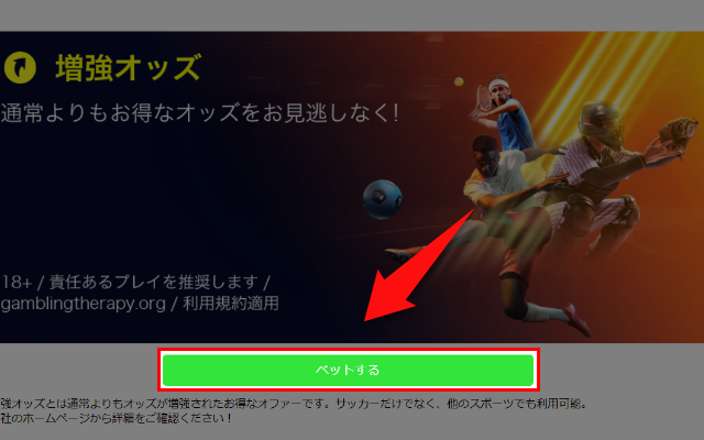 増強オッズ対象試合はプロモーション「増強オッズ」ページにある「ベットする」をクリックすればご確認いただけます。