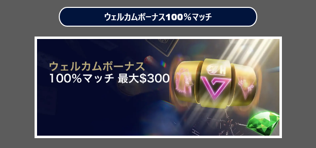 - カジノ用初回入金ボーナスでは最大$300の100%入金ボーナスが貰える