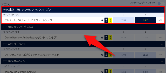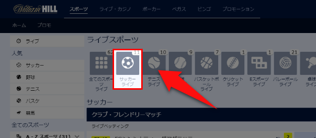 メニュー「ライブ」⇒「サッカー」の順にクリックすれば、サッカーのライブベット一覧が表示されます。