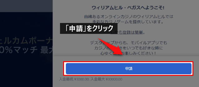 申請後は7日以内に初回入金を完了させてください。ボーナス獲得に必要な最低入金額は$30(3,000円)です。